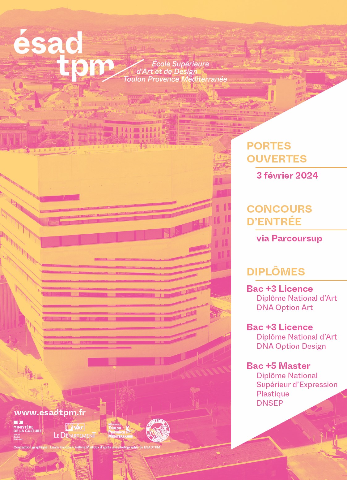 L’ensemble des étudiants et toute l’équipe de l’ésadtpm auront le plaisir d’accueillir le public, les futurs étudiants, les candidats au concours, les parents, amis ... de 10h à 18h le samedi 3 février 2024.